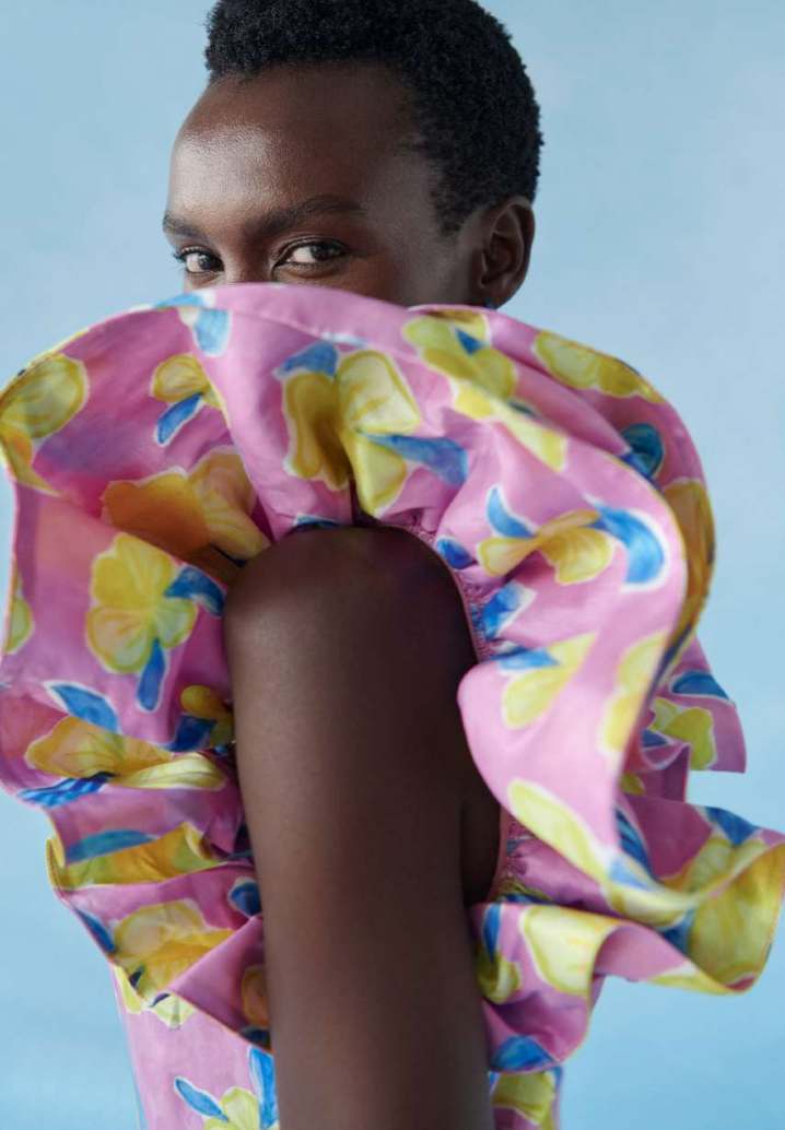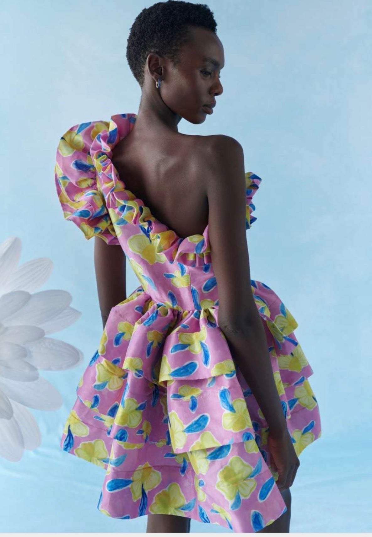 Looking for a cocktail dress? This Floral Baltic short dress is perfect. Short, ruffled skirt, one-sleeve, this piece is perfect to make a statement entrance. With a flattering figure, cinched at the waist and then a ruffled short skirt.