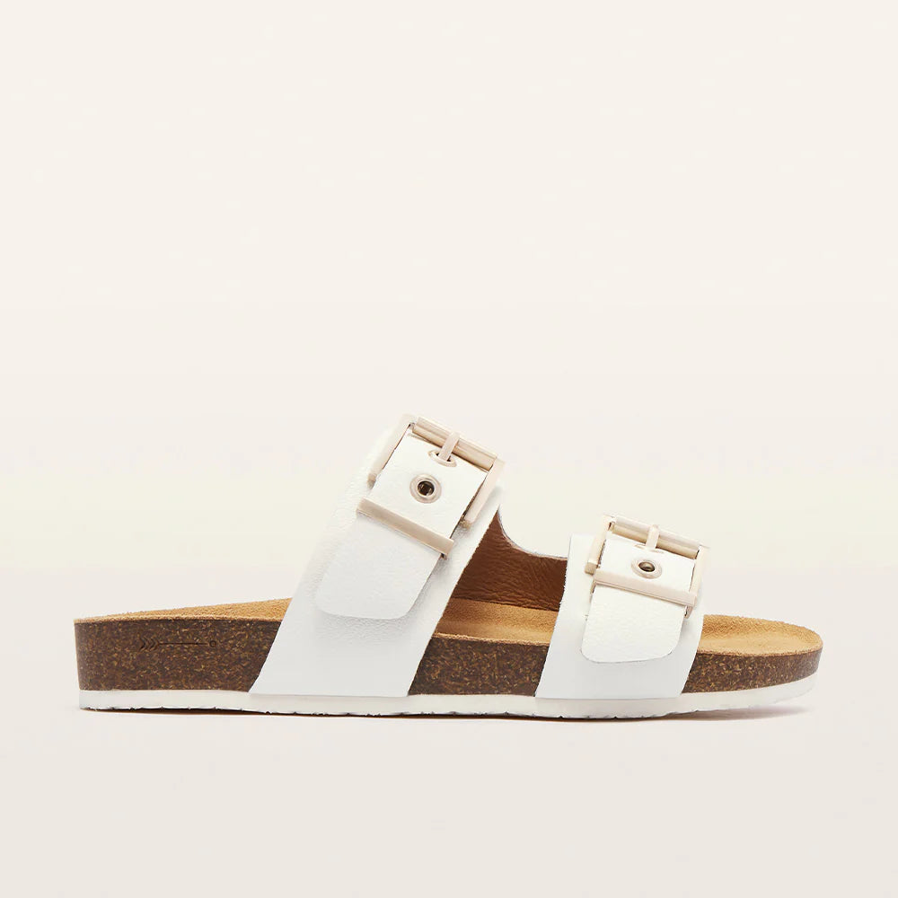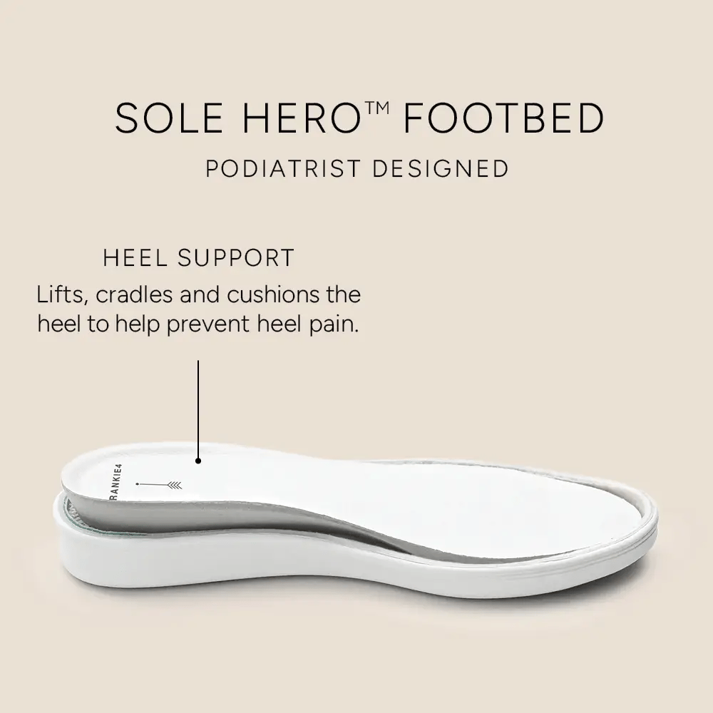 Step into everyday ease and style with Tommy in soft White Tumbled leather. Designed with adjustable straps that open easily to suit slim to wide fits alike and finished with updated hardware, Tommy is grounded in our podiatrist-designed Sole Hero® Footbed to support the heel, arch, and forefoot. This essential slide also features soles moulded with rice husk—an upcycled agricultural byproduct—offering lightweight support with considered detail.