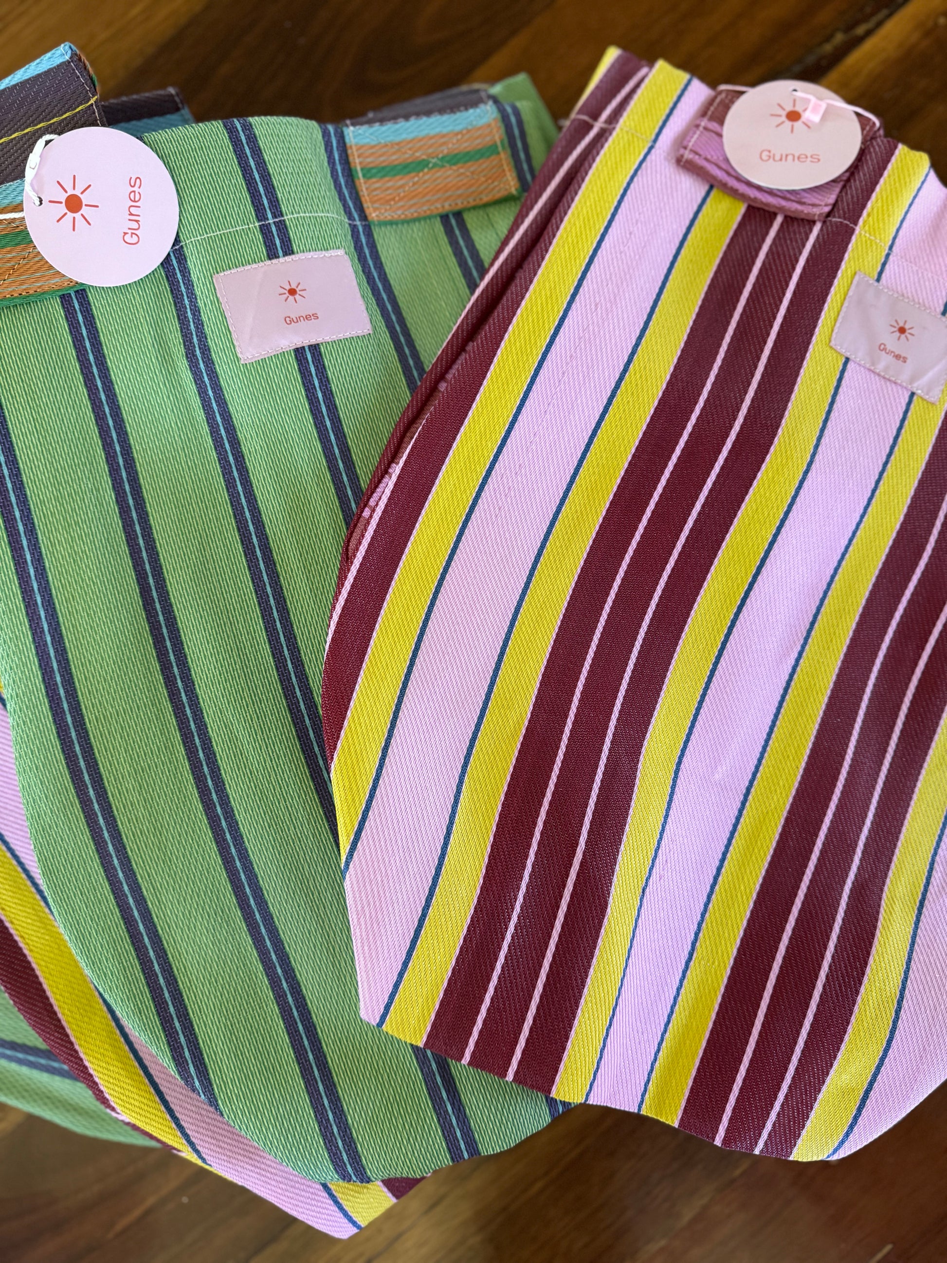 Loose threads, variations in stripe patterns, small pulls in the recycled nylon fabric, natural markings, and slight texture differences in the weave are all considered natural characteristics of the material, not faults. We see these not as imperfections, but as signs of thoughtful, sustainable craftsmanship.
