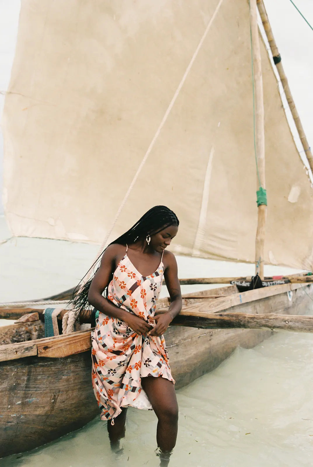 The Cuore Sia Slip Dress in soft blush is an elegant expression of effortless femininity and artisanal resort wear. Featuring a captivating geometric floral print in warm earthy tones, this bias-cut slip dress skims the body beautifully while maintaining a relaxed, flowing silhouette. The delicate spaghetti straps and flattering V-neckline create a timeless, sophisticated look that transitions seamlessly from sun-drenched afternoons to balmy evenings.