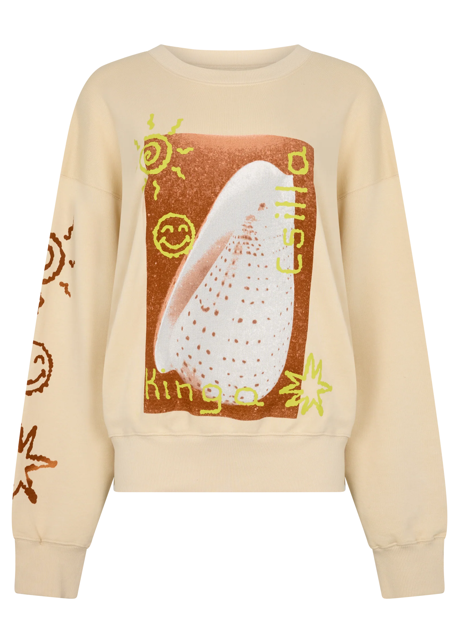 A coastal classic featuring our ultimate sun-soaked artwork - playful shells, smiley suns, and signature KC scribbles. This laidback off-white sweater is about bringing on the good vibes. It's slouchy, ultra-soft, and seriously easy to throw on over anything. Designed for days when you want to channel summer warmth, no matter the season.