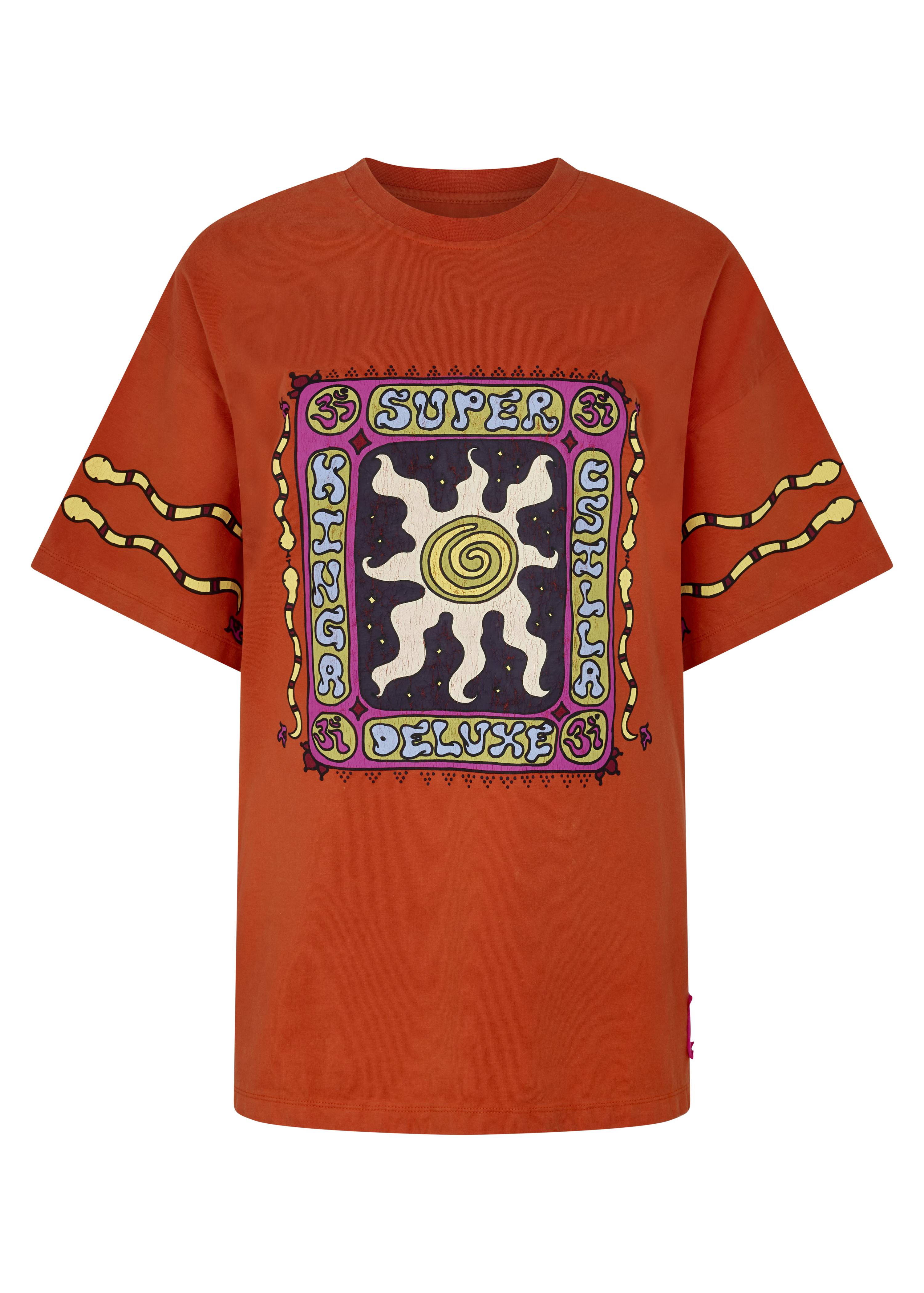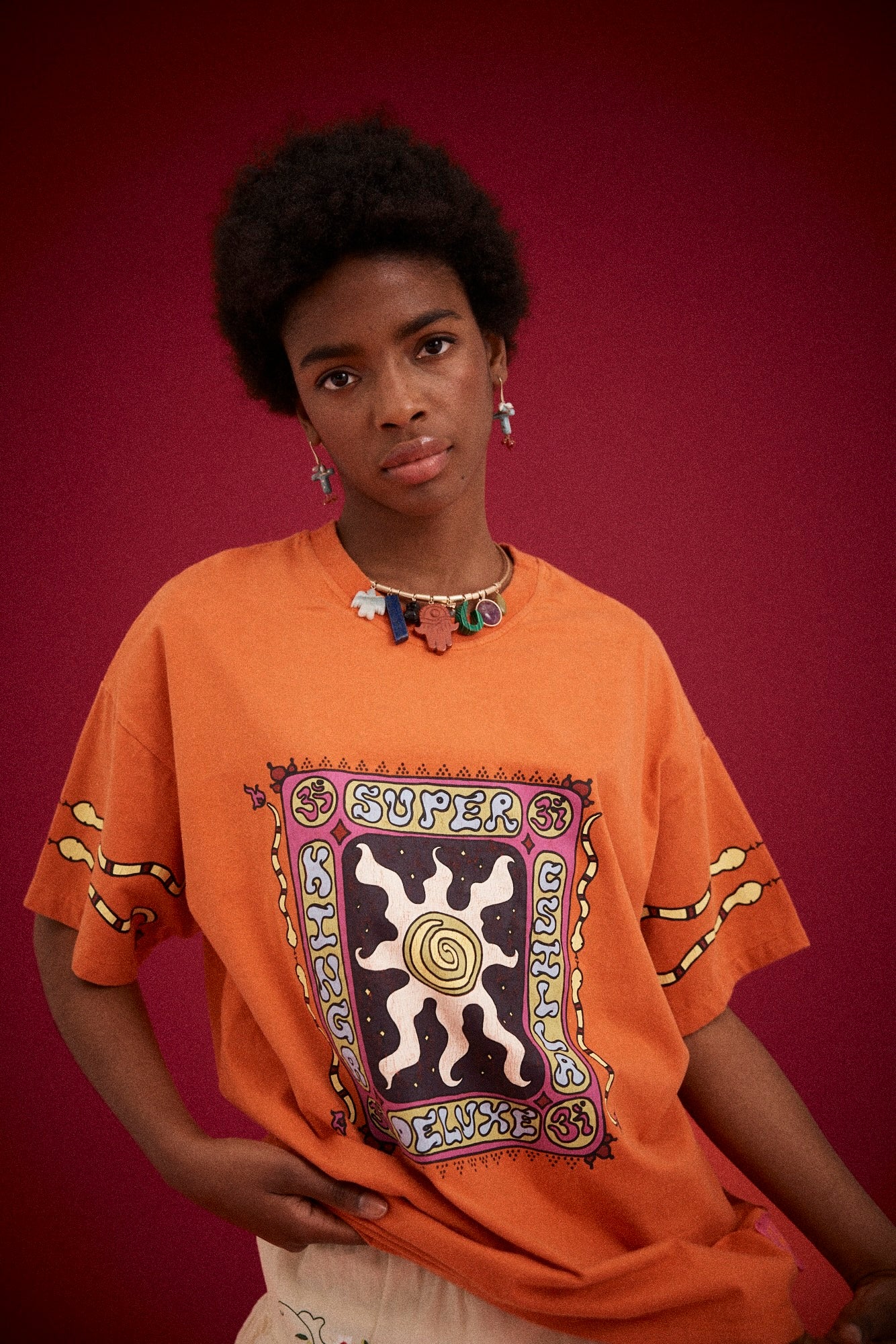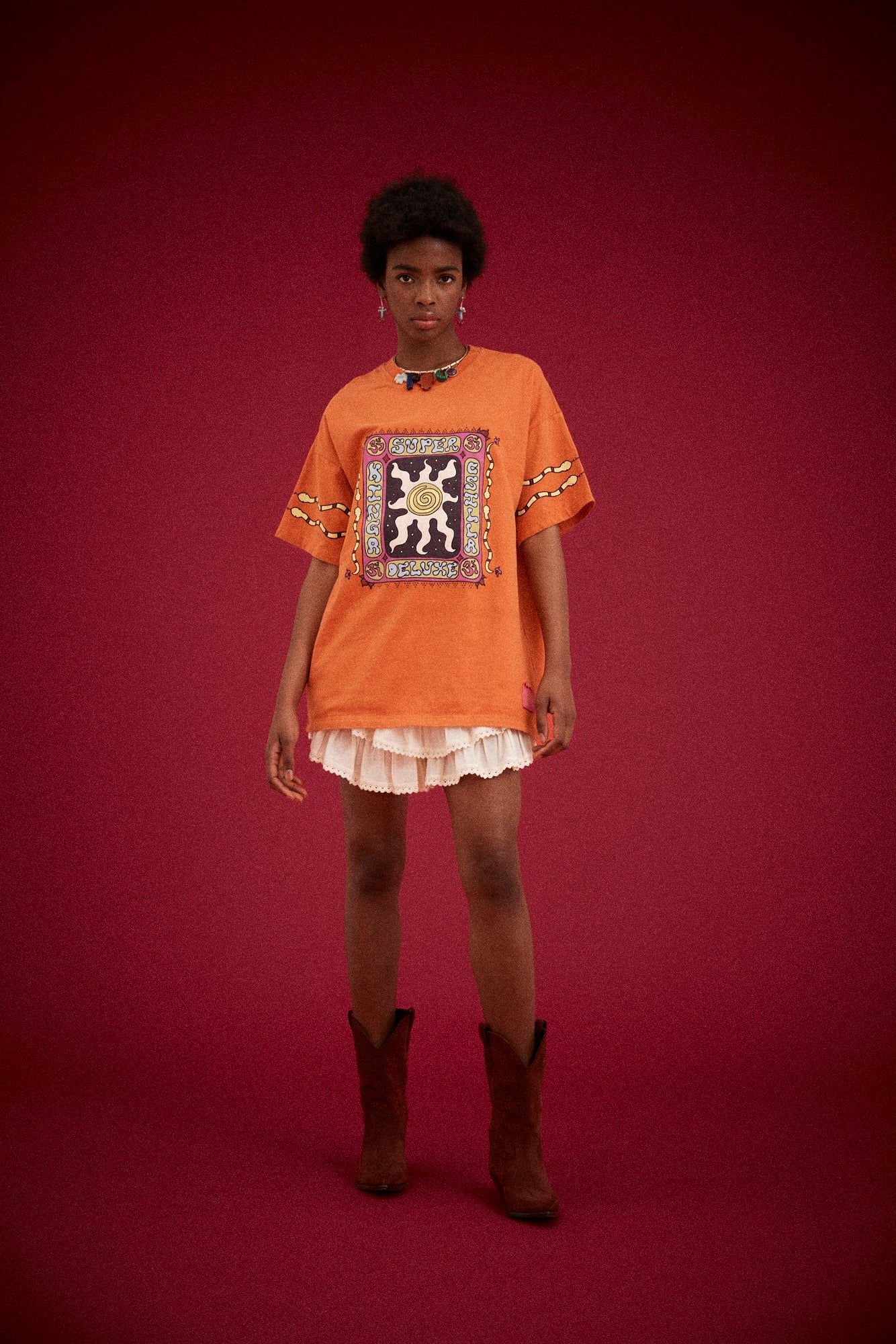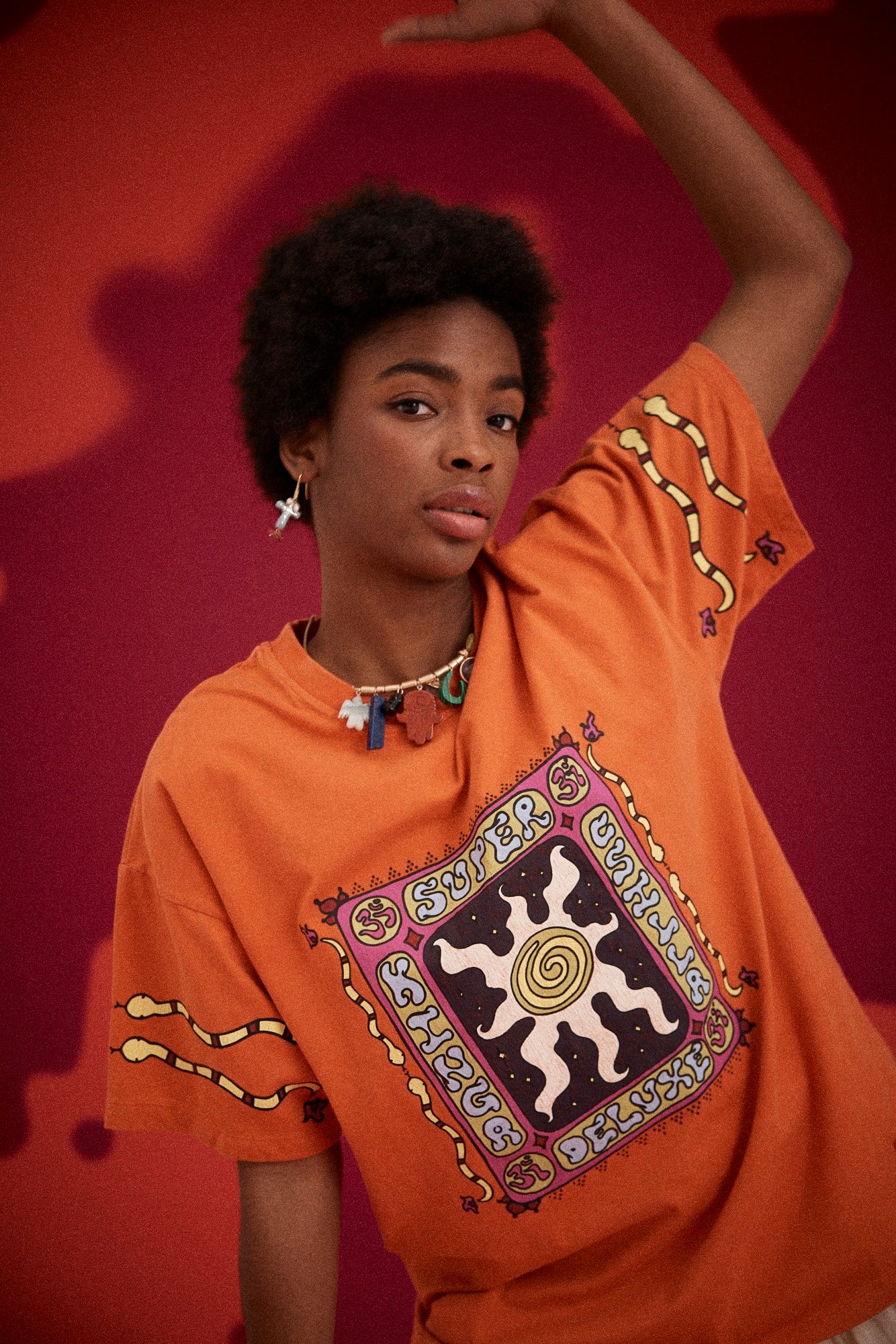 With hand-drawn sun motif in crackle print plus a washed orange base adds to the vintage feel, giving the tee a lived-in, collectible quality.