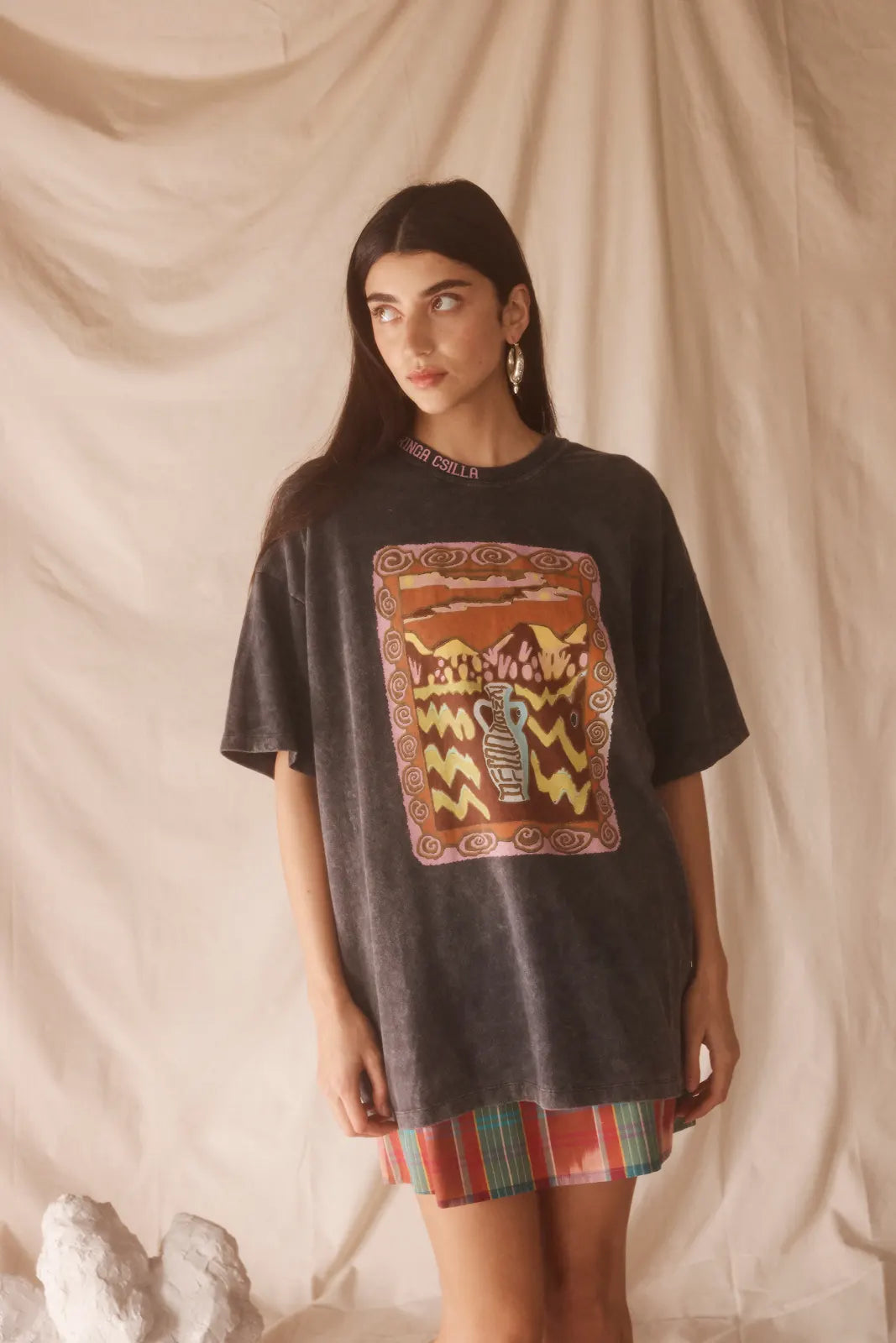 The Verdant Dust Tee in charcoal is an oversized graphic tee featuring a striking hand-drawn print of a desert scape. With its soft stone-washed finish and relaxed silhouette, this handcrafted piece embodies effortless style and everyday luxury. Perfect for the traveller at heart.