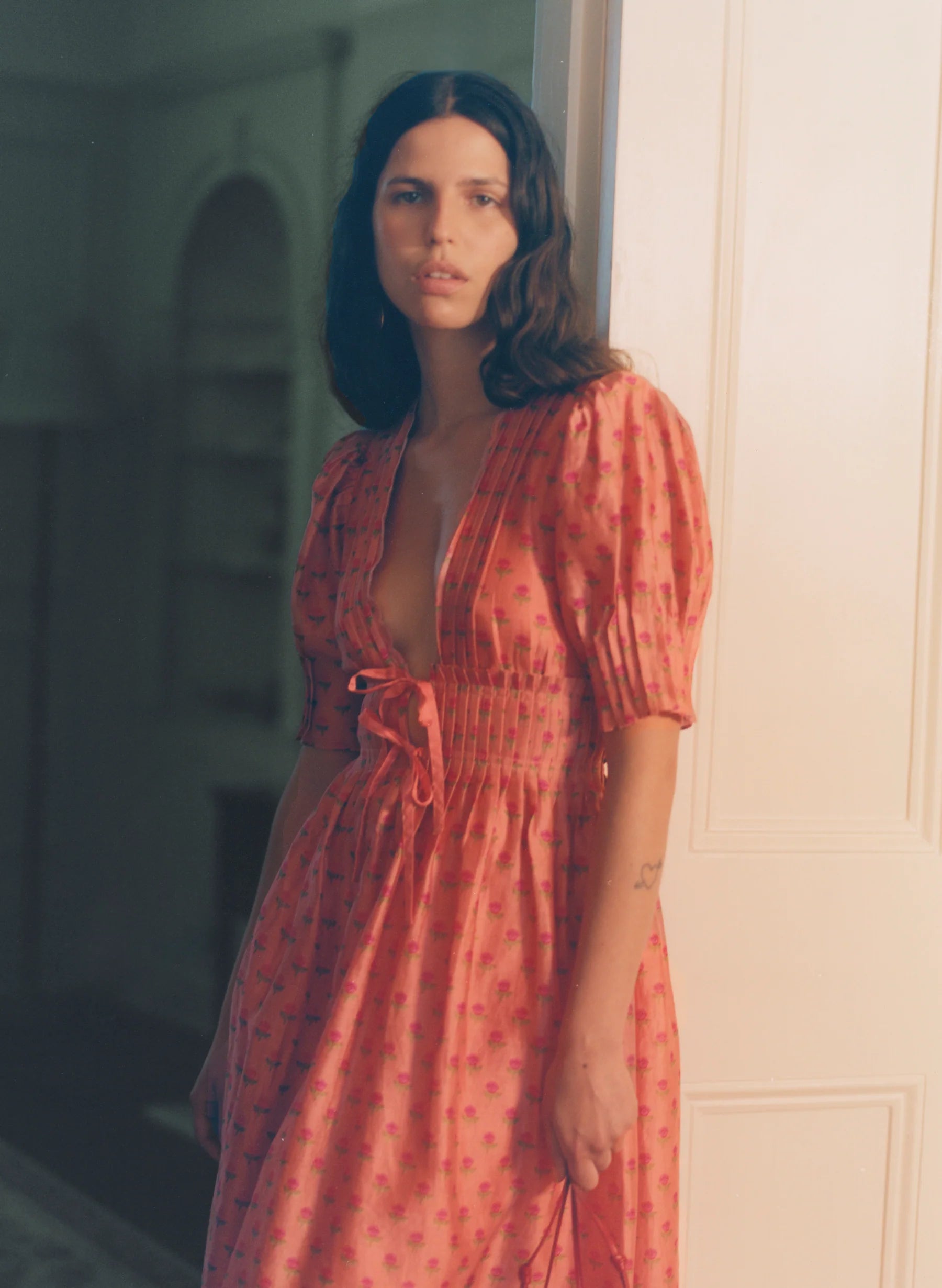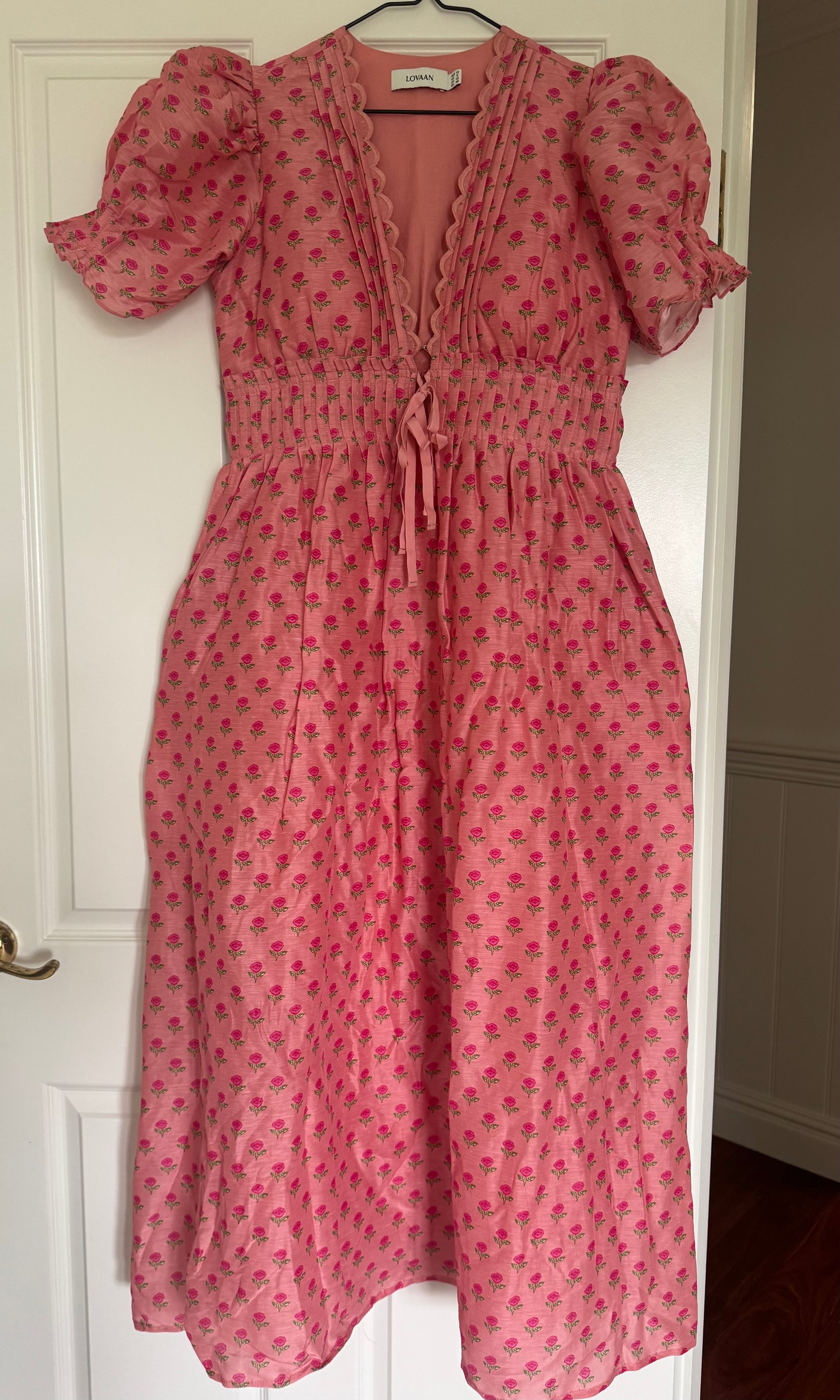 The Boehm Dress in tiny rose print is made from luxurious silk linen, with pin-tucked pleating details, blousy puff sleeves, fitted pin-tucked cuffs, and a double ribbon front detail.