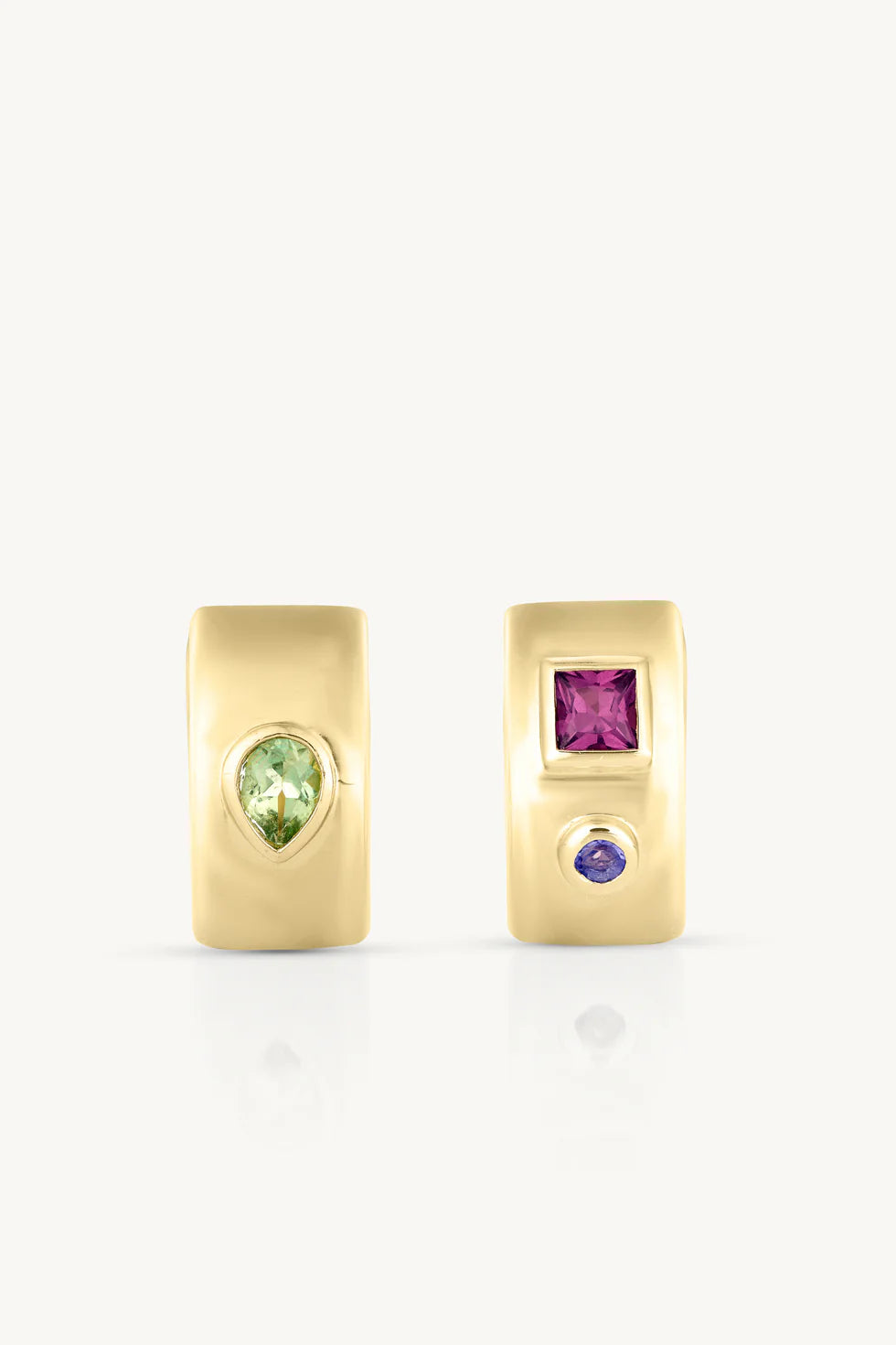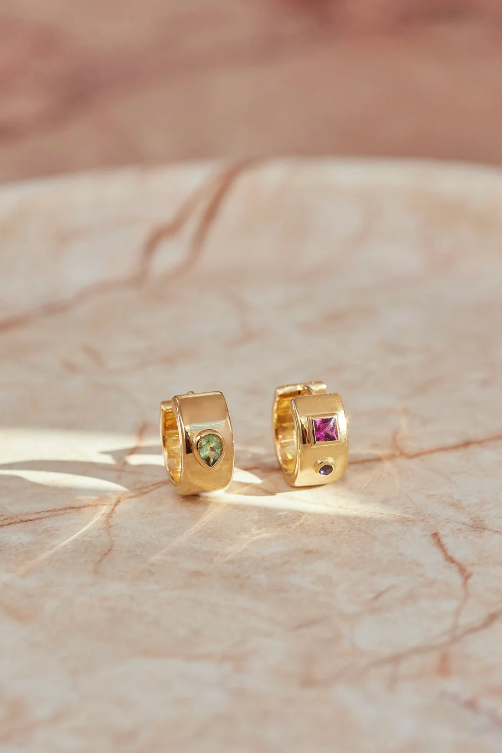One huggie holds a solo pear-cut Apatite, bezel set and bright with colour.